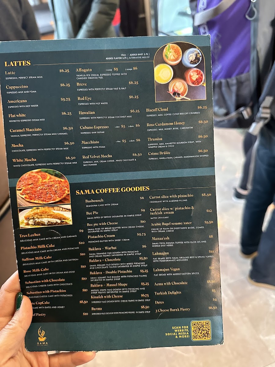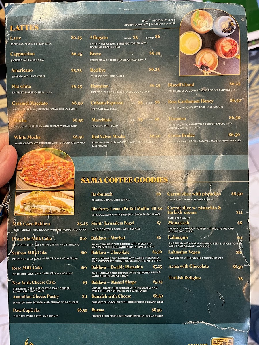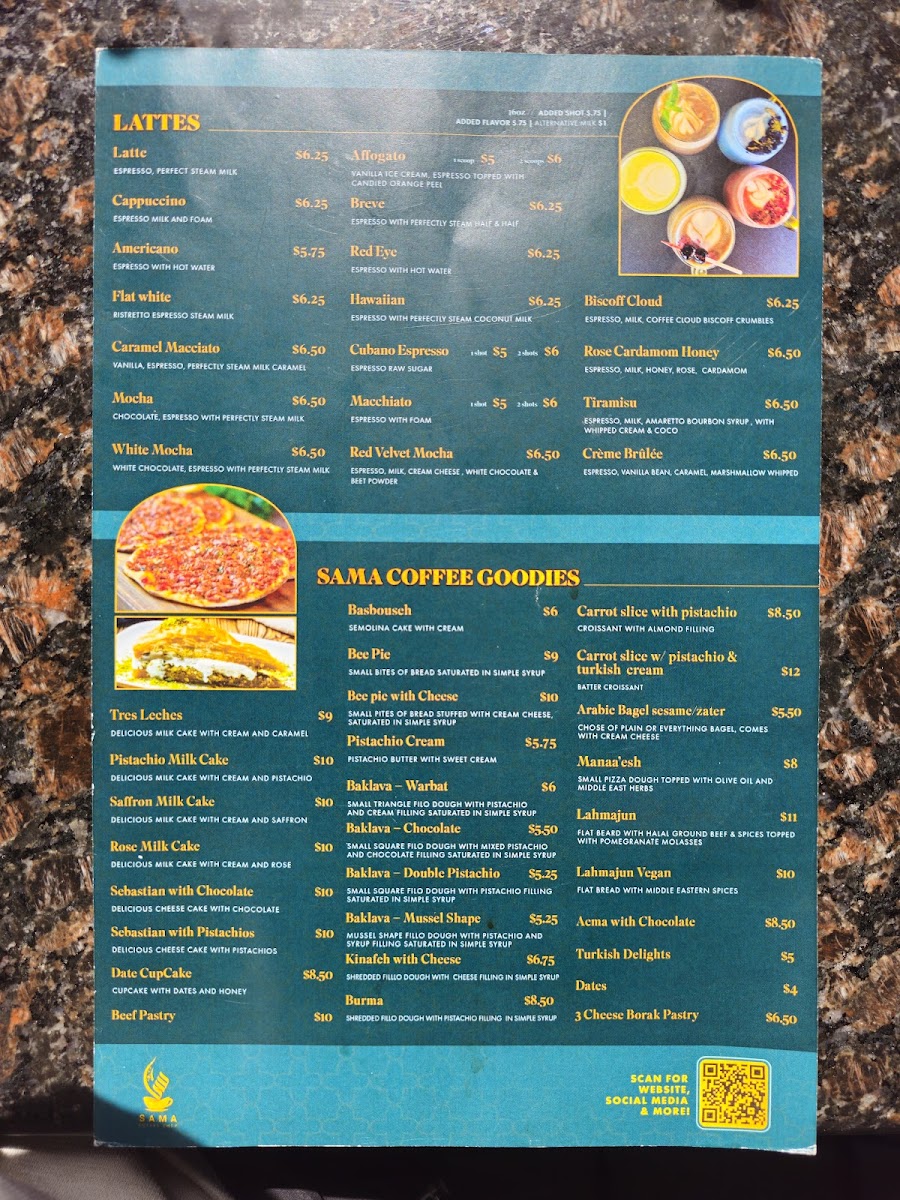 The menu at Sama Coffee Shop features a diverse selection of beverages and light food items, suitable for coffee breaks, casual dining, or light meals throughout the day. The offerings are categorized into four main groups: hot coffee drinks, cold beverages, baked goods and pastries, and specialty sweets.